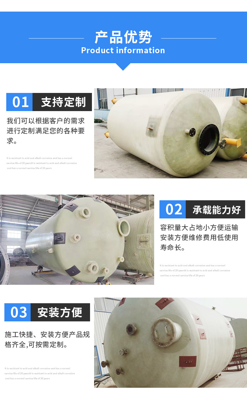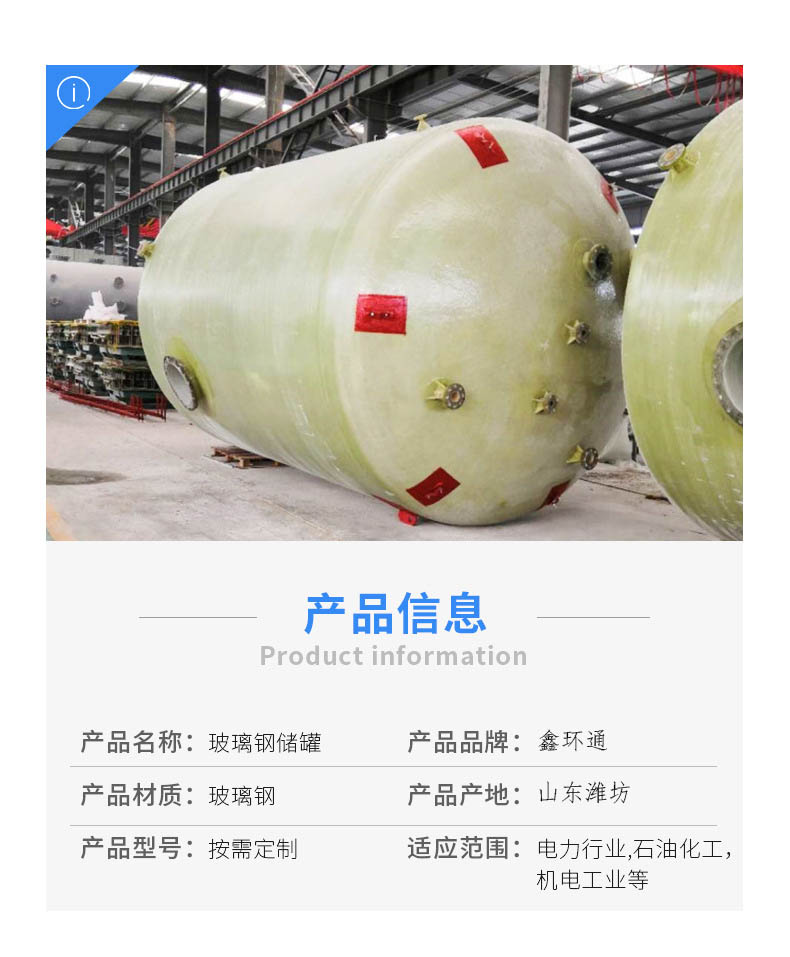 山東環通復合材料有限公司成立于2011年,是從事玻璃鋼儲罐產品的企業,公司位于山東濰坊安丘市。玻璃鋼儲罐分為:立式儲罐和臥式儲罐,有1立方、2立方3立方、4立方、5立方、10立方、12立方、15立方、20立方、25立方、30立方、50立方等,顏色分為:綠色、藍色、黃色等。公司產品主要分為:玻璃鋼儲罐容器,玻璃鋼化糞池,玻璃鋼隔油池,玻璃鋼加砂管道,玻璃鋼脫硫塔,玻璃鋼格柵,玻璃鋼防腐,玻璃鋼儲罐,玻璃鋼管件等。